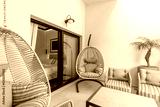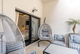 Hotel resort apartment terraces with armchairs, table and hanging egg chair
