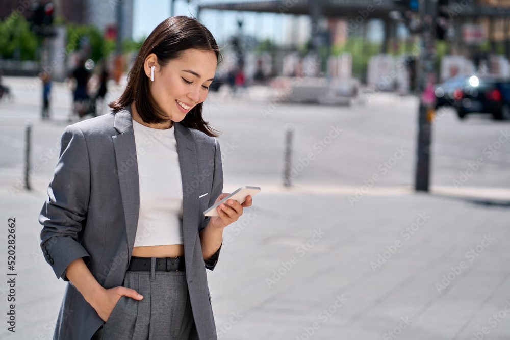Young smiling elegant Asian busy business woman leader wearing suit standing in big city using cell phone platform applications. Smiling woman holding smartphone walking on street outdoors.