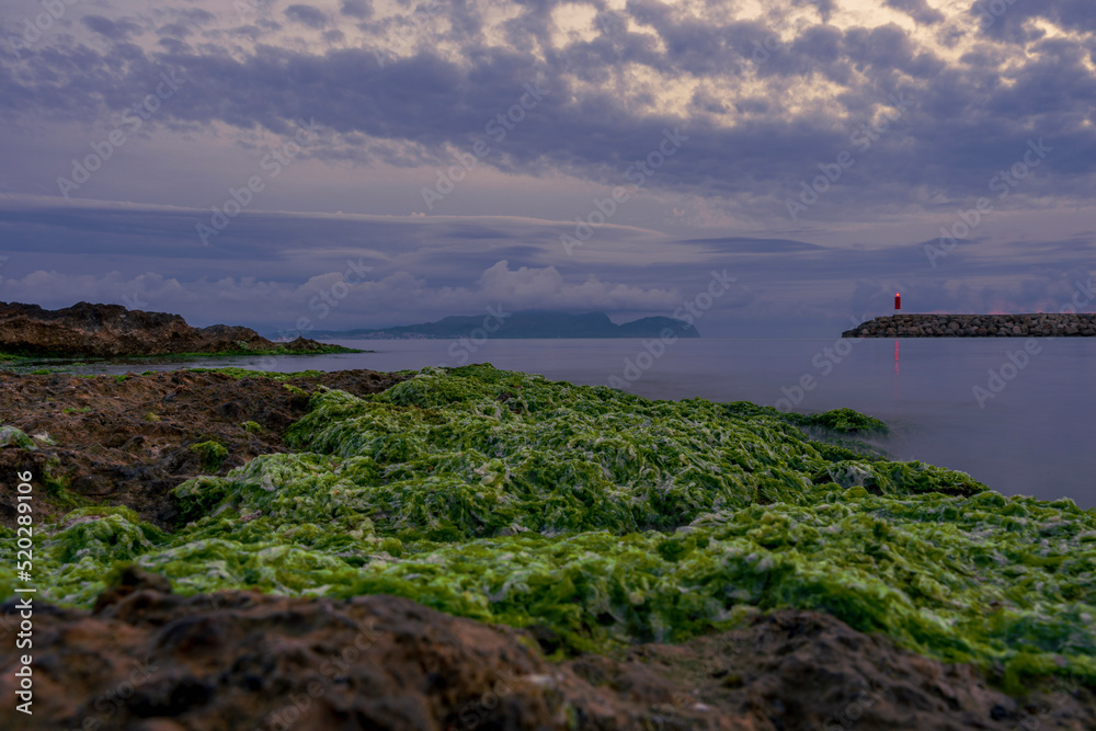 Krajobraz morski o wschodzie słońca, zachmurzone niebo, gładka tafla wody.