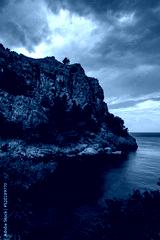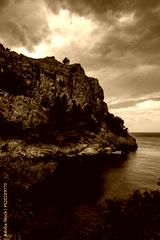 Skaliste wybrzeże w deszczowy pochmurny dzień. Pionowy kadr.