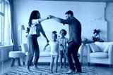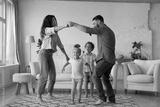 Happy active young parents and little kids playing active games at home together, learning dance to music in living room, holding hands, having fun, celebrating moving, house buying, enjoying party