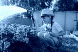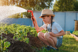 Child watering plants in garden. Kid with water hose in sunny backyard. Little girl gardening. Summer outdoor activities during the summer holidays in the village.