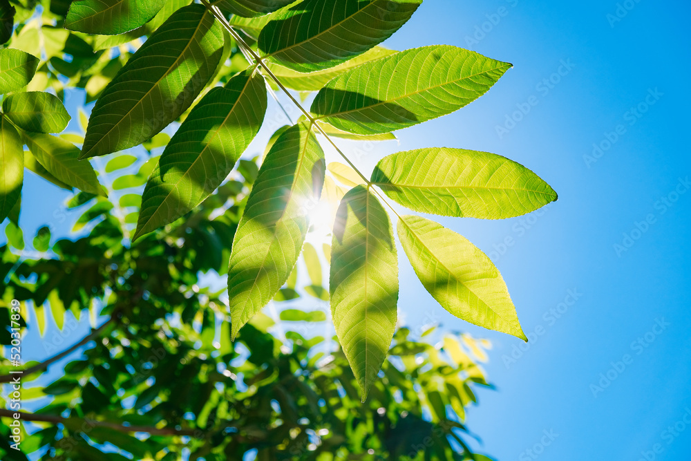 background of green leaves in the spring and summer season in the hot sun in the blue sky