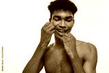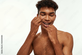 Partial of black guy brush teeth with dental floss