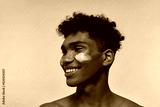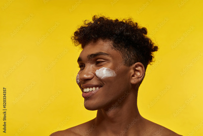 Guy with cosmetic cream on his face looking away