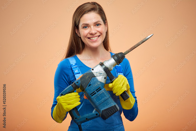 woman in blue overalls holding punching machine. Isolated female portrait.