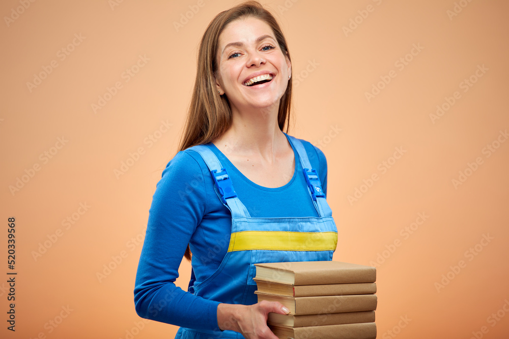 Happy woman worker or student in overalls blue uniform standing with book. isolated on beige.