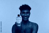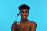 Black guy hold and show bottle with shower gel