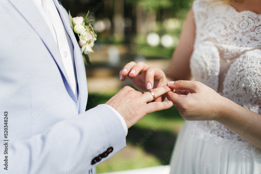 Bride and groom exchange rings at the wedding ceremony