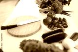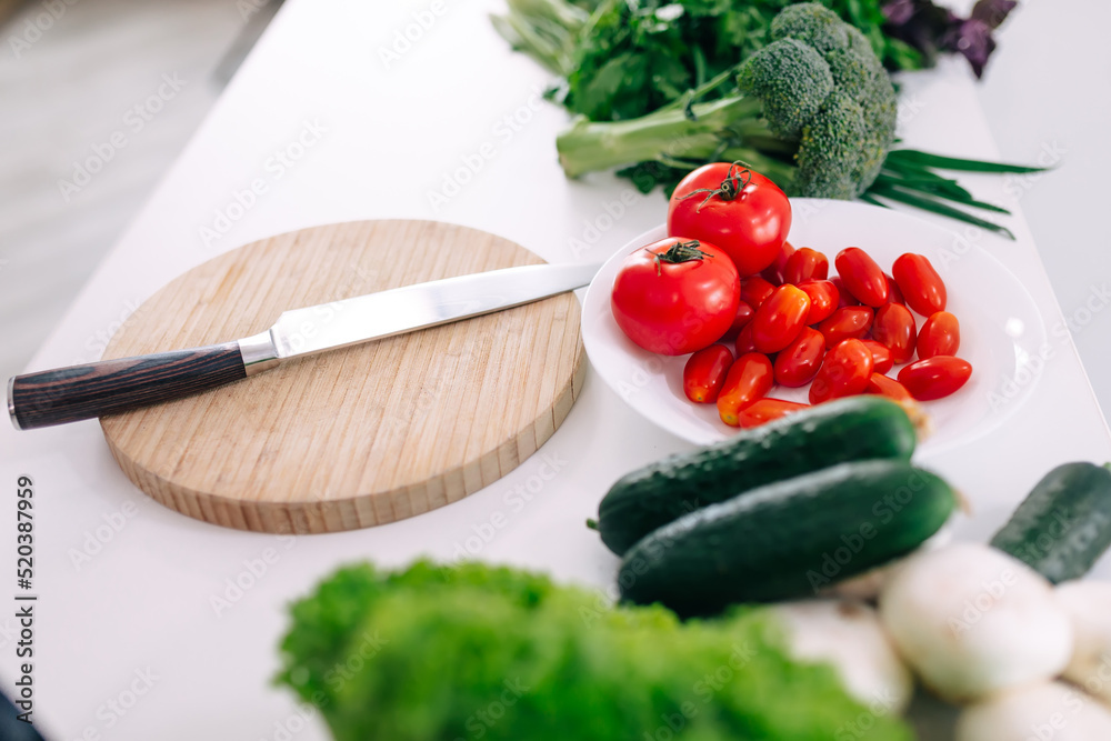 ingredients for cooking vegan dishes, vegetables, roots, spices, mushrooms and herbs. Cutting board, chef's knife, peeler .. Healthy food concept.