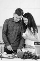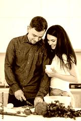 a young man cuts tomatoes into a salad while the girl drinks cof