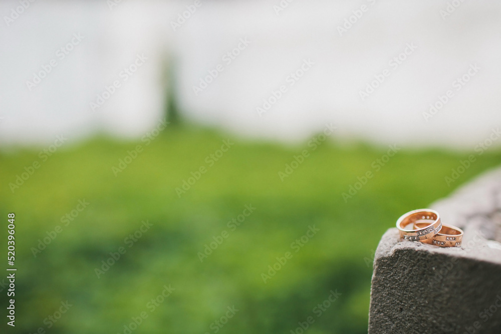 Two wedding rings on a grey stone