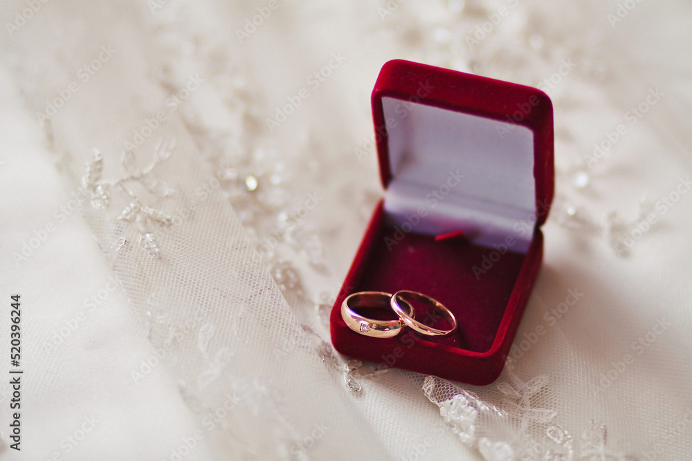 Two wedding rings in a red box on a dress