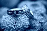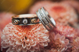 Two wedding rings on a pink flower