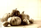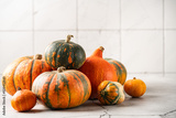 Thanksgiving or Halloween autumn decorations with heirloom mini reen and orange pumpkins against a rustic white autumn background.