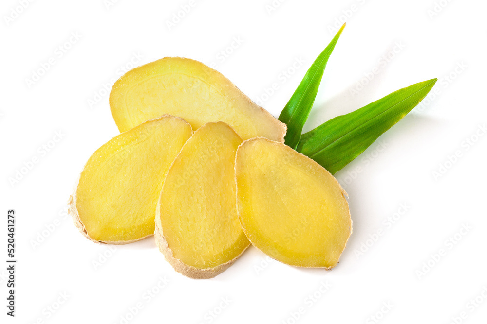 fresh ginger slices and leaves on white.