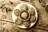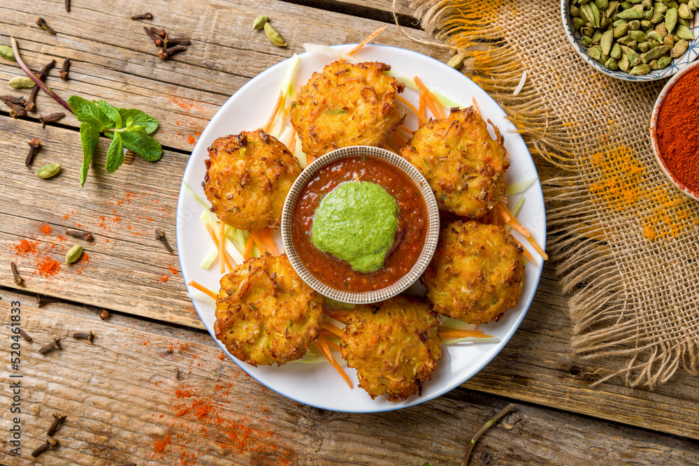 Mix veg pakora with tomato mint sauce on old wooden table top view