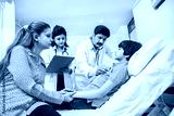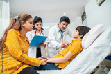 Indian doctor of pediatrician holding stethoscope checking heartbeat of sick boy kid at hospital wile her mother sitting by his side. health checkup, children medical insurance care.