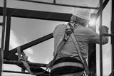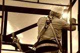 Industrial steel roof truss welder with Fall arrestor device for worker with hooks for safety body harness on the construction site.