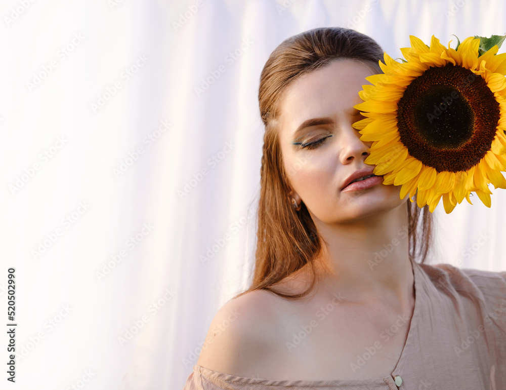 Romantic woman with sunflowers over white fabric background. Clean skin and natural beauty. Rural summer vacation, Closed eyes closeup. Copy space