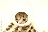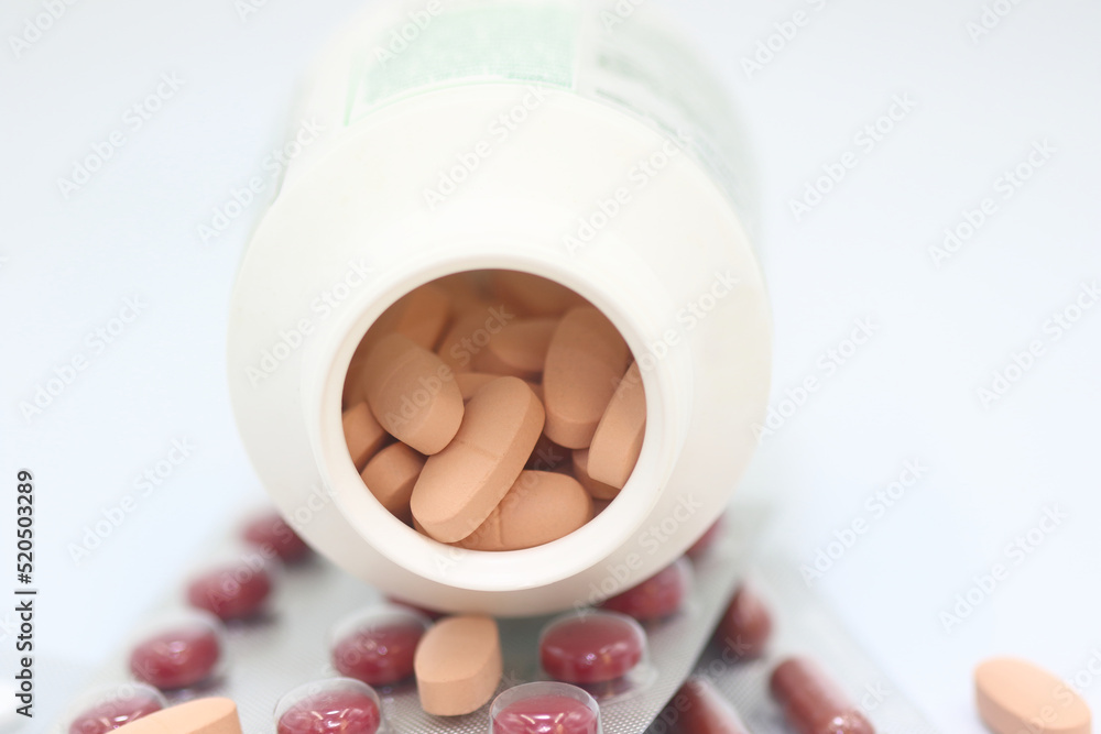 Close up of white pill bottle with spilled out pills on white background Pharmacy drugstore concept.