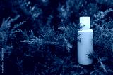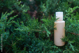 Yellow cosmetic bottle with serum, essential oil or other skin care product in forest outdoors. Natural Organic Spa Cosmetic Beauty concept. mockup