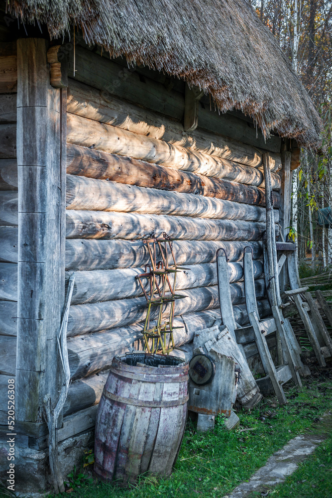 stare narzędzia rolnicze oparte o drewnianą stodołę