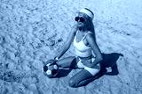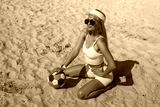 athletic young female in sunglasses on the beach in summer with a soccer ball