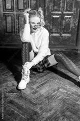 Fashion shot of a blonde girl wearing modern youth clothes. College, school style. Hipster girl wearing glasses by a brick wall. Youth fashion.