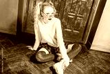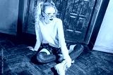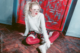 Fashion shot of a blonde girl wearing modern youth clothes. College, school style. Hipster girl wearing glasses by a brick wall. Youth fashion.