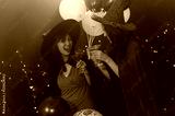 Two beautiful young woman in witch halloween costumes drinking cocktail and holding balloons in halloween party over dark magic background - Holiday party concept.