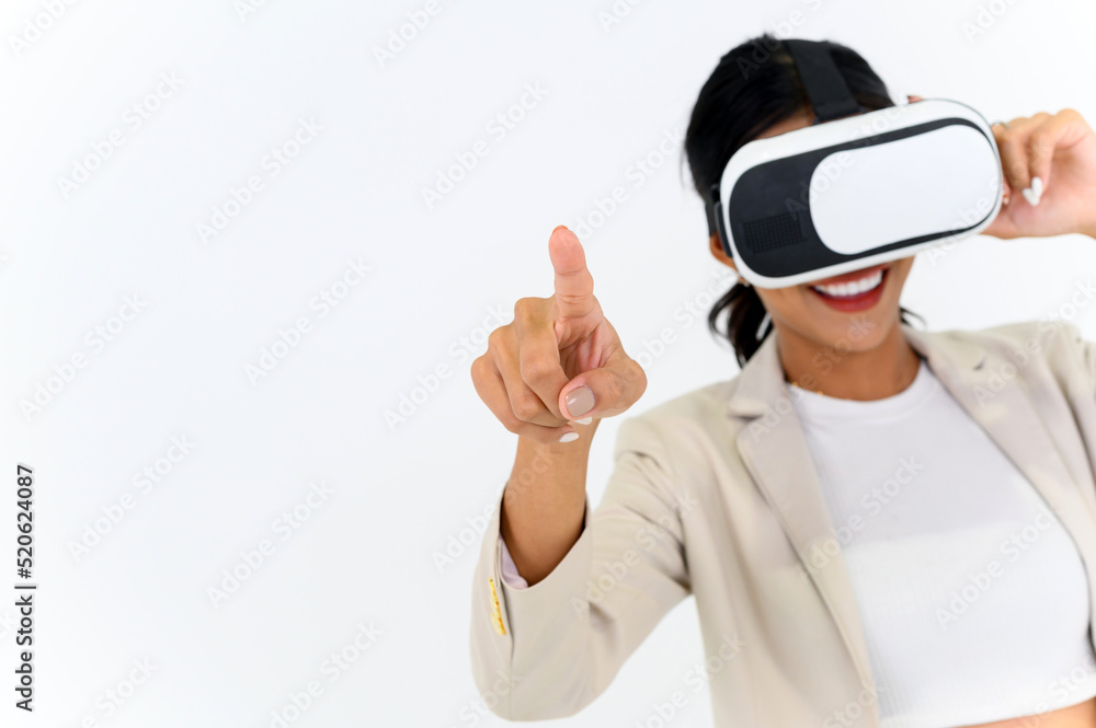 business woman in informal suit wearing VR goggles pointing in the air while standing isolated on white background. concept of Metaverse, virtual reality, future, technology, and internet of things.
