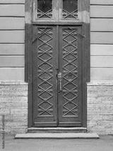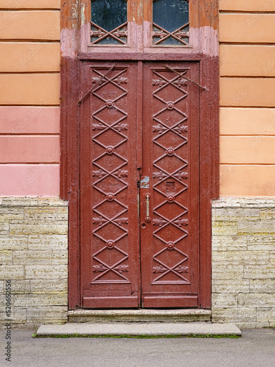 Closed ancient brown door to the front door of an old city house