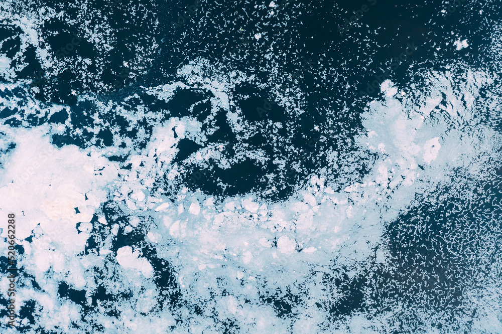 Natural background of ice on the river. Textured cold frosty surface of ice on the river. Ice texture in blue and white tones. Textured cold frosty surface of ice.