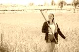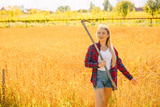 Woman farmer holding a hoe to inspect a beautiful field during warm light organic farming concept concept of living with nature rural.