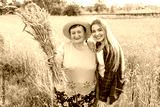 Cute girl and her grandmother have fun in the wheat field. Family, lifestyle concept