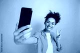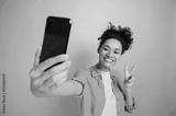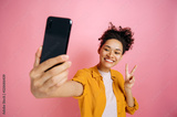 Happy positive african american excited girl, blogger, in casual stylish wear, doing selfie shot on cellphone and smiles into the camera, shows peace symbol, posing on isolated pink background, smiles