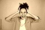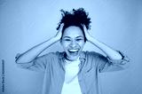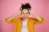 Stunned cheerful joyful african american girl in casual clothes with curly hair, screaming with joy, won a victory, holds her hands on her head, stands on an isolated pink background, laughs