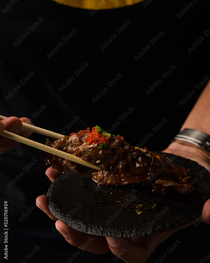 Man holding A dish of sliced and roasted Japanese beef on top of rolled vinegared rice,Wagyu sushi on black plate.