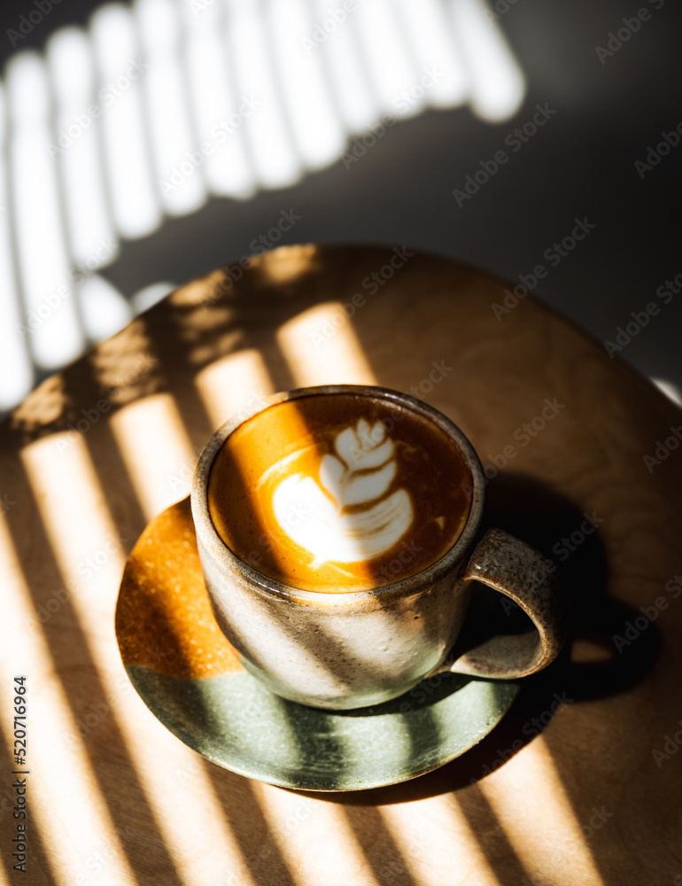 Cup of coffee latte on wood table at coffee shop in morning time . Top view. Copy space.Coffee latte topview.