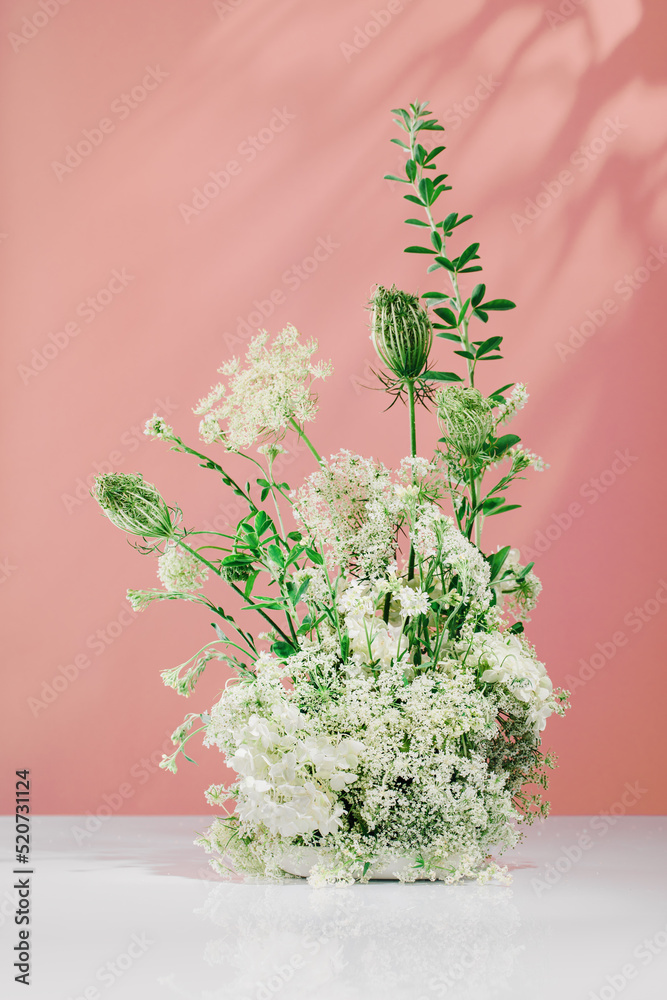 Wild white flowers arrangement ikebana on calm pastel pink background. Gift Card spring or summer feeling ikebana. Pink forest series