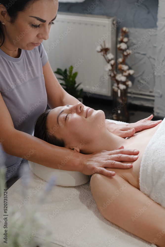 face massage with oil in traditional style made by professional beauty therapist women. anti-age massage