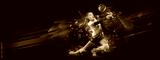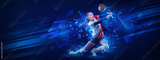 Flyer. Creative artwork with female volleyball player in motion with ball isolated on dark blue background with neoned elements. Art, creativity, sport
