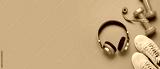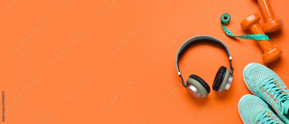 Sports shoes with headphones, measuring tape and dumbbells on orange background with space for text