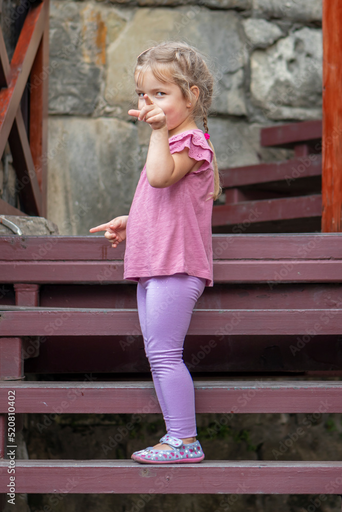 A beautiful 4-year-old girl on a neutral background points to something with her finger, an emotional look.