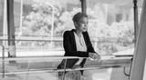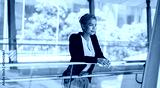 Successful businesswoman leaning on glass railing on a modern office balcony