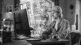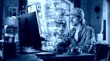Young Handsome Man Using Desktop Computer To Check Social Media, Listen To Music and Read Emails. Creative Person Catching Up With Friends Online. 3D Visualization of Online Platforms Concept.