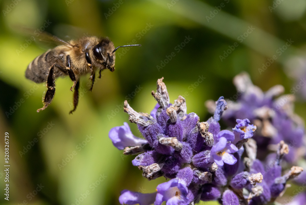 Bee flying at a lavender flower, macro view. A honey bee working at garden with Lavandula angustifolia, close up.