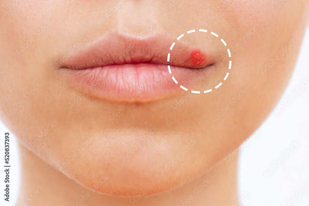 Herpes on the lip. Blisters on the mouth of a young woman isolated on a white background. Itching and redness on the girl's face. Close up