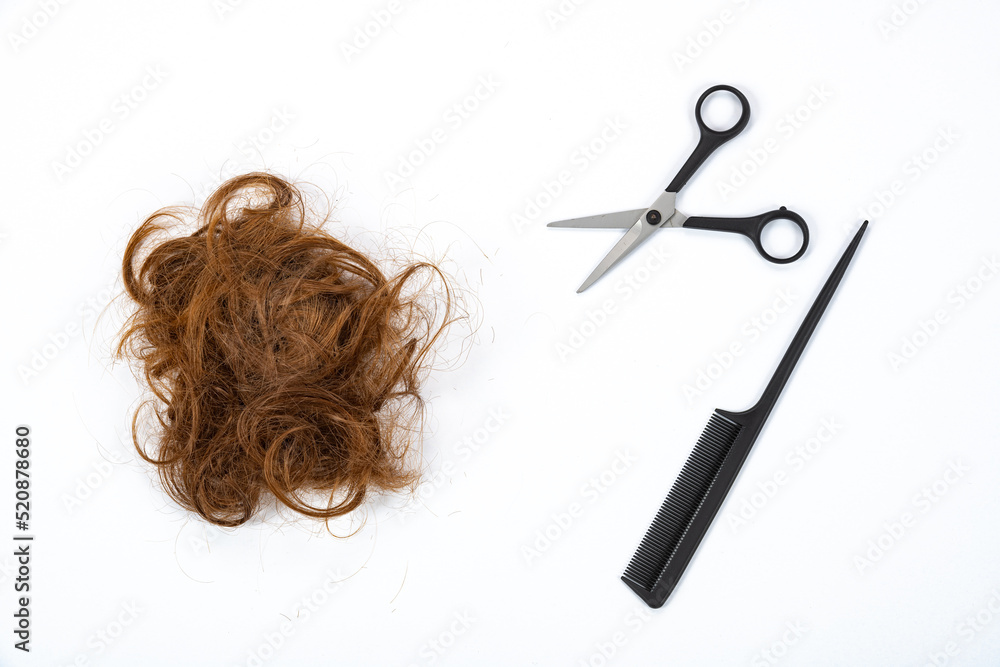 Haircut tools with a clump of cut auburn hair isolated on white with a shallow depth of field and copy space